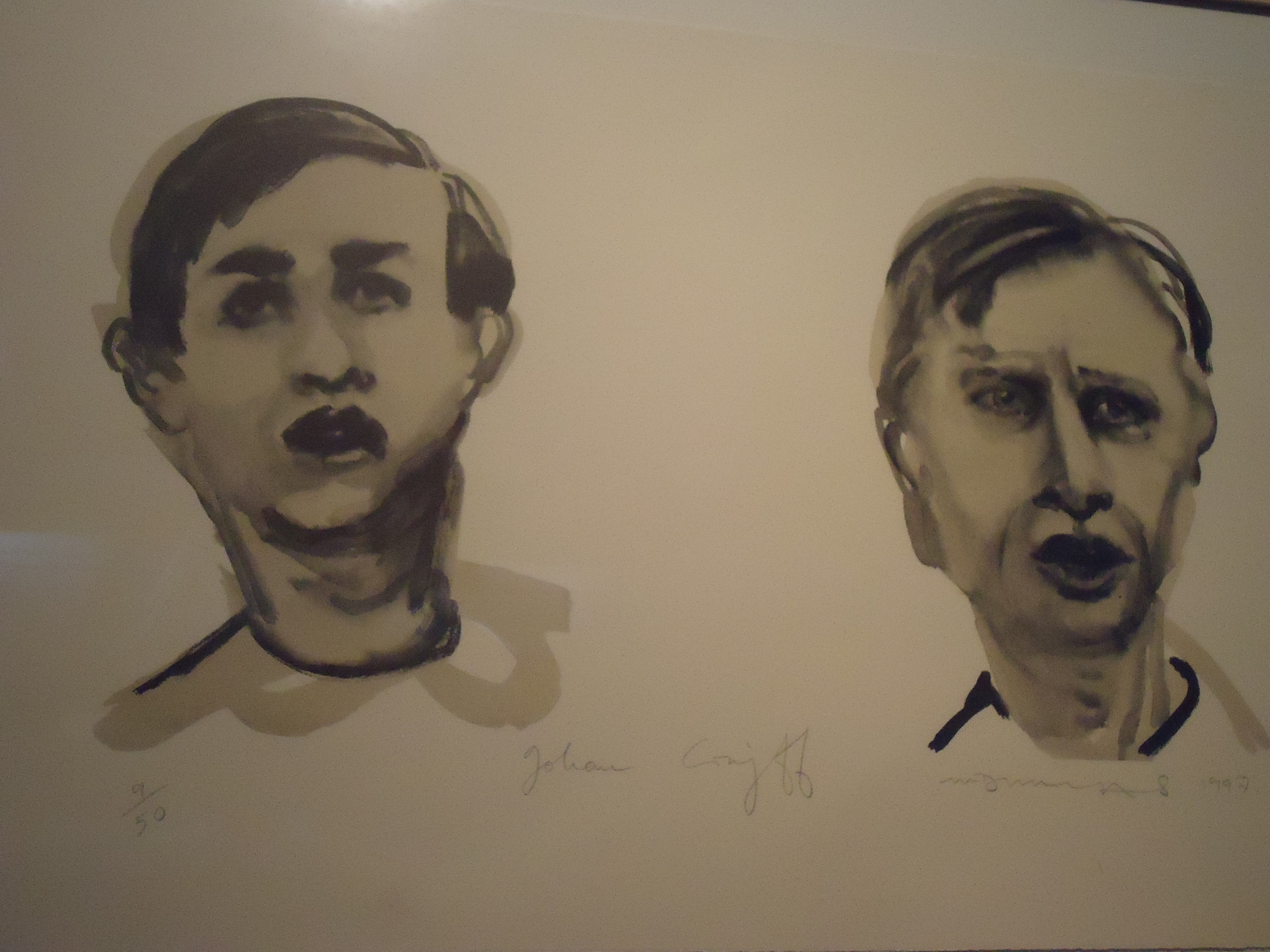 * Johan Cruijff heeft laten weten met weinig vertrouwen uit te kijken naar de dramaserie die de VPRO vanaf 24 februari over hem gaat uitzenden, inclusief een ‘lekker’ onderwerp als de WK-zwembadscène van 1974. Niemand minder dan Marlene Dumas bezorgt Cruijff deze week troost in hoger sferen op de Realisme-beurs voor hedendaagse figuratie in Amsterdam. Artkitchen Gallery biedt voor 3500 euro het dubbelportret aan dat Nederlands meest succesvolle hedendaagse kunstenares van onze grootste voetballegende maakte. De oplage van vijftig is uitgevoerd in steendruk, uitgevoerd door Marcel Kalksma.