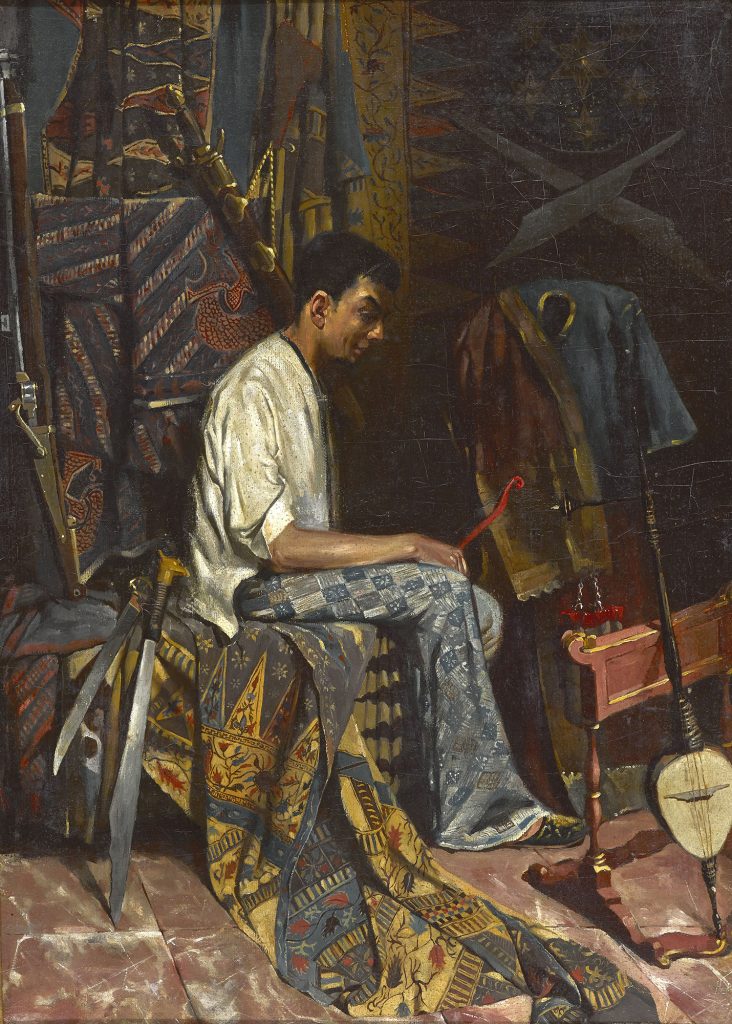 Van jongs af aan was Jan Toorop een zelfbewust charismatisch persoon die volstrekt zijn eigen gang ging en vooral in de beginjaren nadrukkelijk zijn roots onderzocht. Het was zijn artistieke basis. Zo opent de tentoonstelling met een vroeg zelfportret uit 1880 van Toorop in gebatikte kleden. Voor Indo-Europese mannen was het ongebruikelijk om batik te dragen, dus dit schilderij zou je kunnen zien als een viering van zijn Javaanse identiteit. In die vroege jaren leest hij veel over de geschiedenis van Nederlands Indië, waaronder Multatuli’s Max Havelaar, maakt hij veel schilderijen en aquarellen waarop Indische voorwerpen te zien zijn. Ook hangt er uit die beginjaren een naakt zelfportret in een badkamer vol batik-kleden.