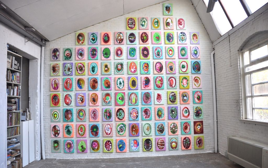 *‘One hundred thoughts’ heet dit kunstwerk van de Nijmeegse kunstenares Seet van Hout (1957). Het hangt momenteel in Museum Het Valkhof in Nijmegen. Eigenlijk zijn het 100 schilderijtjes: 10 keer 10. Het zijn net pupillen van ogen, of eilanden, of plakjes edelgesteente. Als je er één korte blik op werpt is alles een beetje meer van hetzelfde, variaties op een thema, maar wie dichtbij gaat kijken ontdekt in elk doek een eigen universum. Het is een bonte explosie van verf. Van Hout is gefascineerd door de werking van onze hersenen en door groei, bloei en verval. Zij schildert nooit met kwasten. Schilderijen ontstaan door het gieten van verf op het liggende doek, dunne en nog dunnere verf die een verbinding aangaat en in kleur en vorm aan de plantenwereld refereren. Prachtig vind ik het.