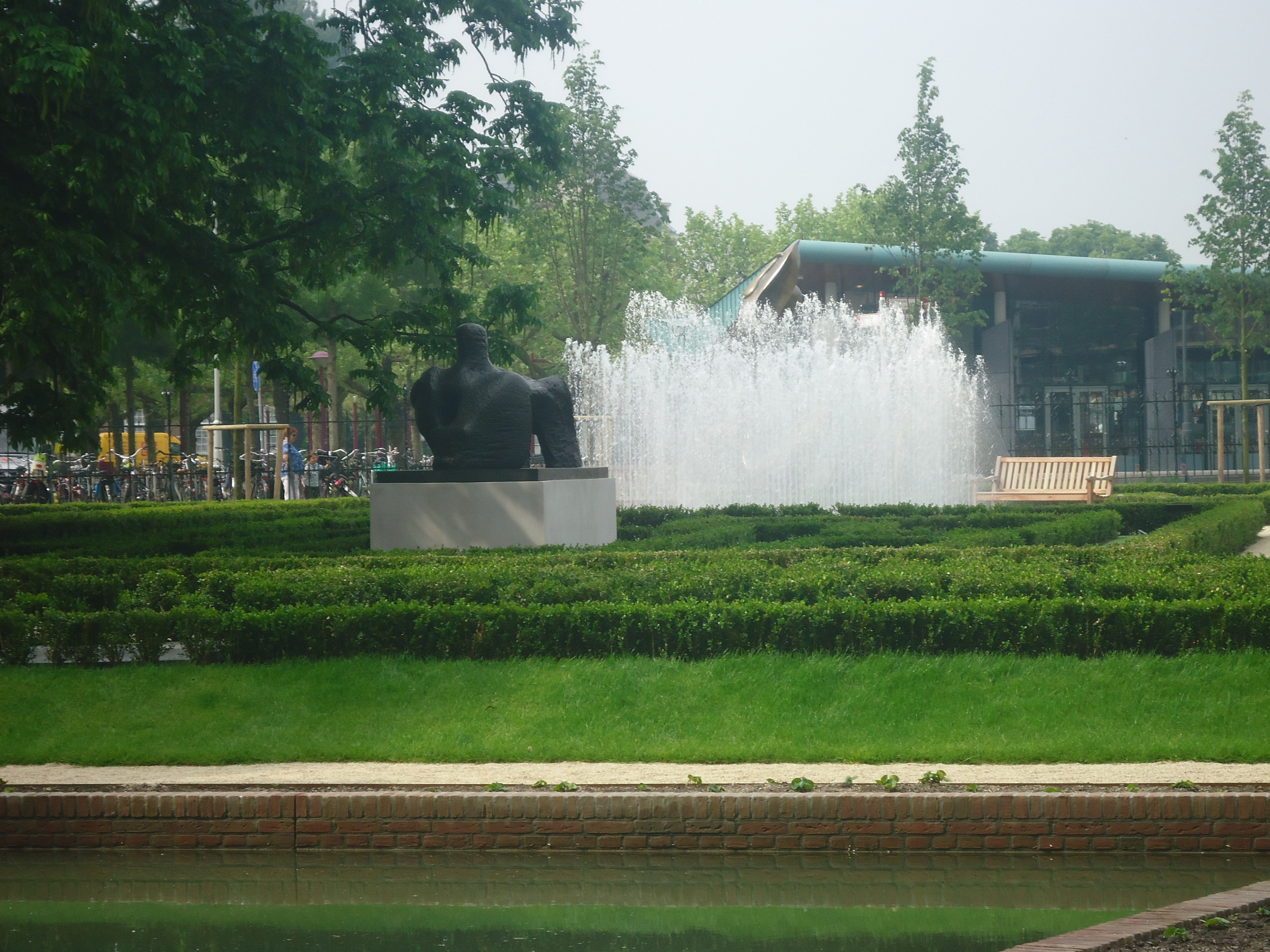 Er is genoeg ruimte voor beelden, ook voor die met monumentale formaten. Het grootste beeld van Moore dat naar Amsterdam kwam - ‘Large Reclining Figure’ uit 1984 - is bijvoorbeeld meer dan negen meter lang en weegt 2000 kilo. De liggende vrouwenfiguur moest voor het vervoer in vier delen worden gesplitst. In Perry Green ligt ze op een heuvel aan het eind van een uitgestrekt weiland, waar ze prachtig contrasteert met steeds wisselende luchten. Maar ook in de voortuin van het Rijksmuseum met op de achtergrond de negentiende-eeuwse gevel, komt ‘Large Reclining Figure’ perfect tot zijn recht. Om de zichtbaarheid van de beelden te vergroten zijn de centrale gazons in de voorheen platte tuin opgetild als groene podia, vertelde Copijn-landschapsarchitect Sander Rombout tijdens de persvoorbezichtiging.