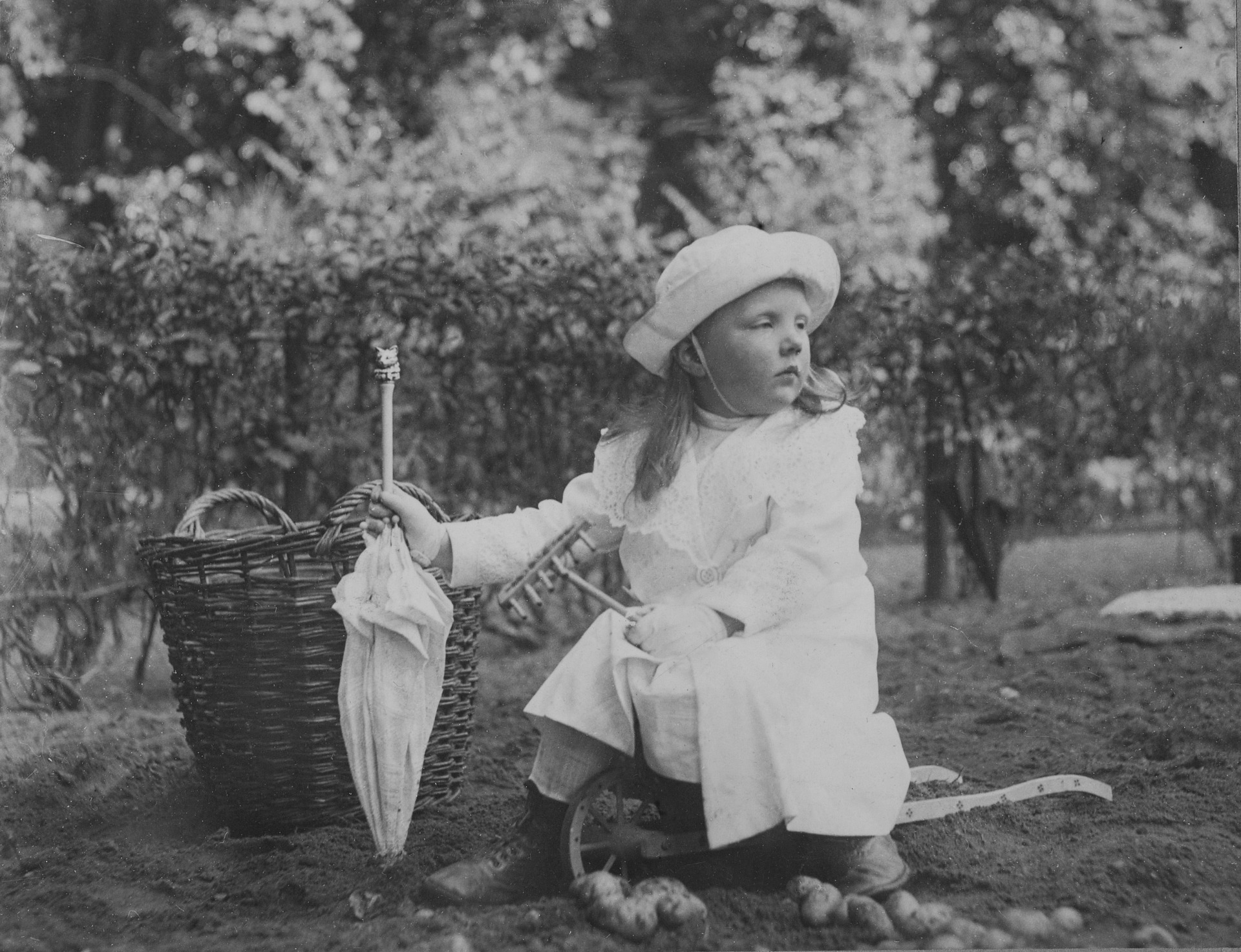 *Lekker ravotten? Dat zal Juliana (1909) in haar paasbest mooie jurkje - met hoedje op en parasol mee - vermoedelijk niet gemogen hebben nadat koningin Wilhelmina in 1913 klaar was met fotograferen in de moestuin bij het Zwitserse chalet van Paleis Het Loo. Toen conservator kostuums en textiel Trudie Rosa de Carvalho op zoek ging naar vroege zomerse afbeeldingen van Wilhelmina en Juliana, kwam ze vooral officiële staatsiefoto’s tegen. Volgens de chique kindermode van die tijd droegen de meisjes witte jurkjes en jasjes van katoen en linnen versierd met borduursels, gekleurde linten, strikken, rozetten en mooie randjes en kantjes. Er hoorde volgens de conservator ook altijd een bijpassende onderjurk bij.